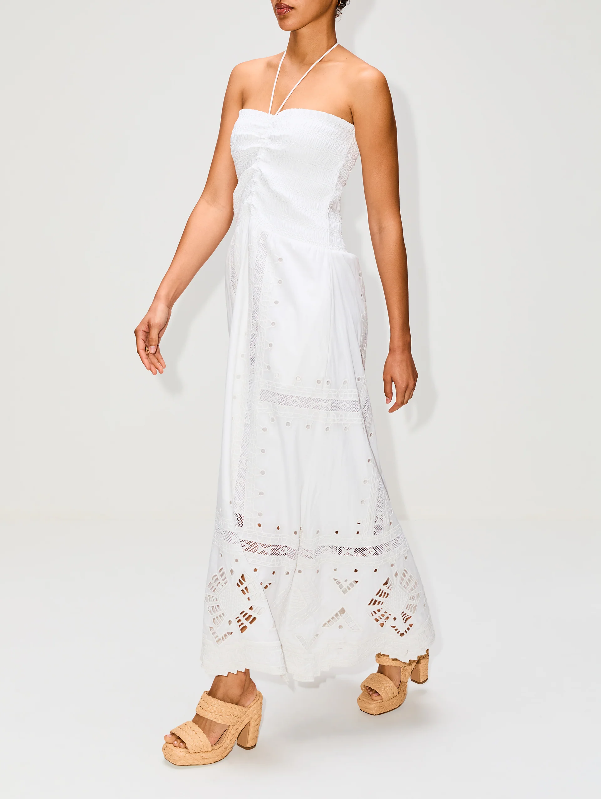 Maria Chers' summer-ready dress features minimal neck bows along the fitted strapless top, perfectly balancing the airy drape and intricate cutouts on the skirt's hem.