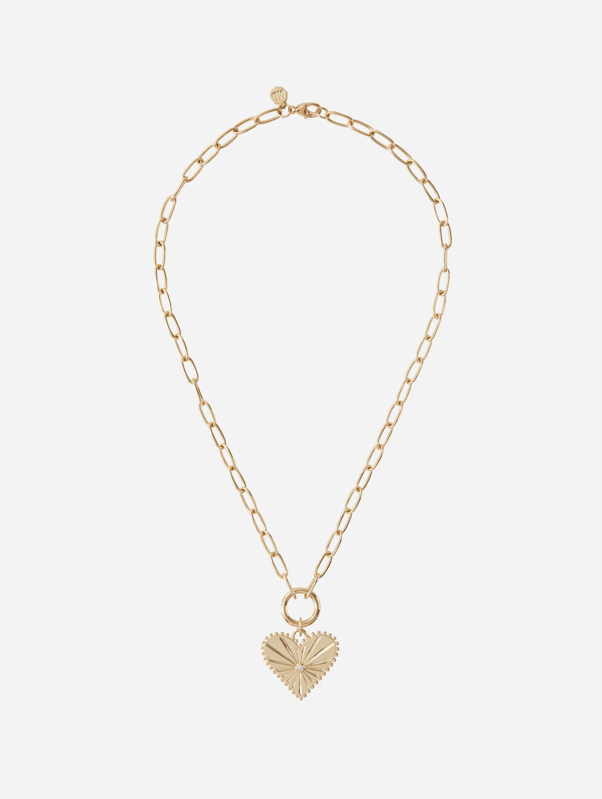 Handcast in 14k yellow gold, the intricate details makes this is a standout piece for your collection. With gold balls studding the edge of the heart, the sunbursts lead to the central point: a brilliant white diamond. The engraving to the back reads, 'Pour Toujours Et à Jamais' or 'Forever and Always'. A beautiful, romantic sentiment.