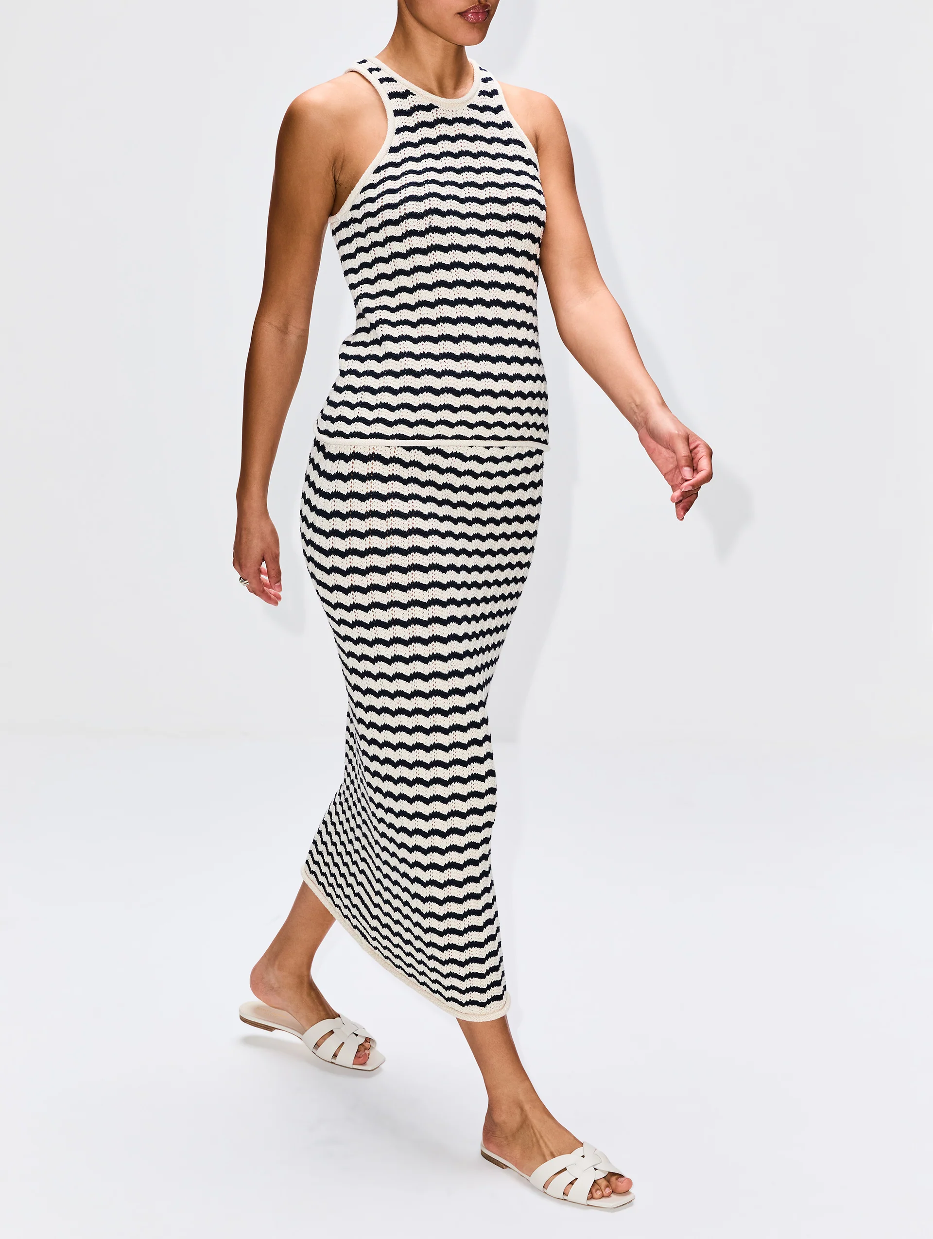 Textured and soft in a knit fabric, the Alexa Skirt features a decadent slim fit and a chic stripe pattern that can be worn as a set with the designer's matching tank.