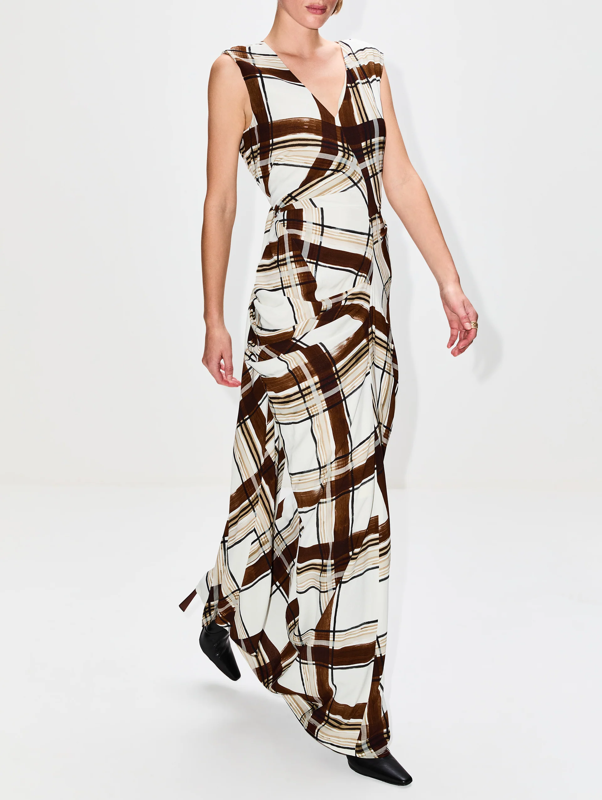 This midi dress showcases a tartan check print accented by a sleeveless fit, V neckline and a gathered waistline that falls in a delicately skimming silhouette.