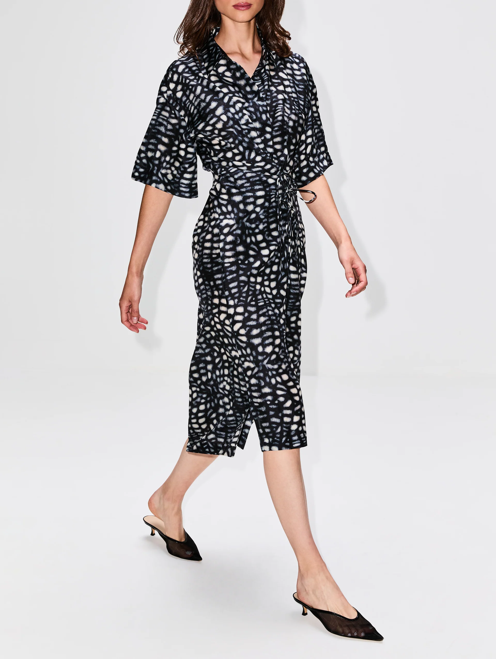 This draped shirtdress design and midi length are as artful as its allover print. The modern silhouette is enhanced by intricate ties that give shape to the flowing fit.