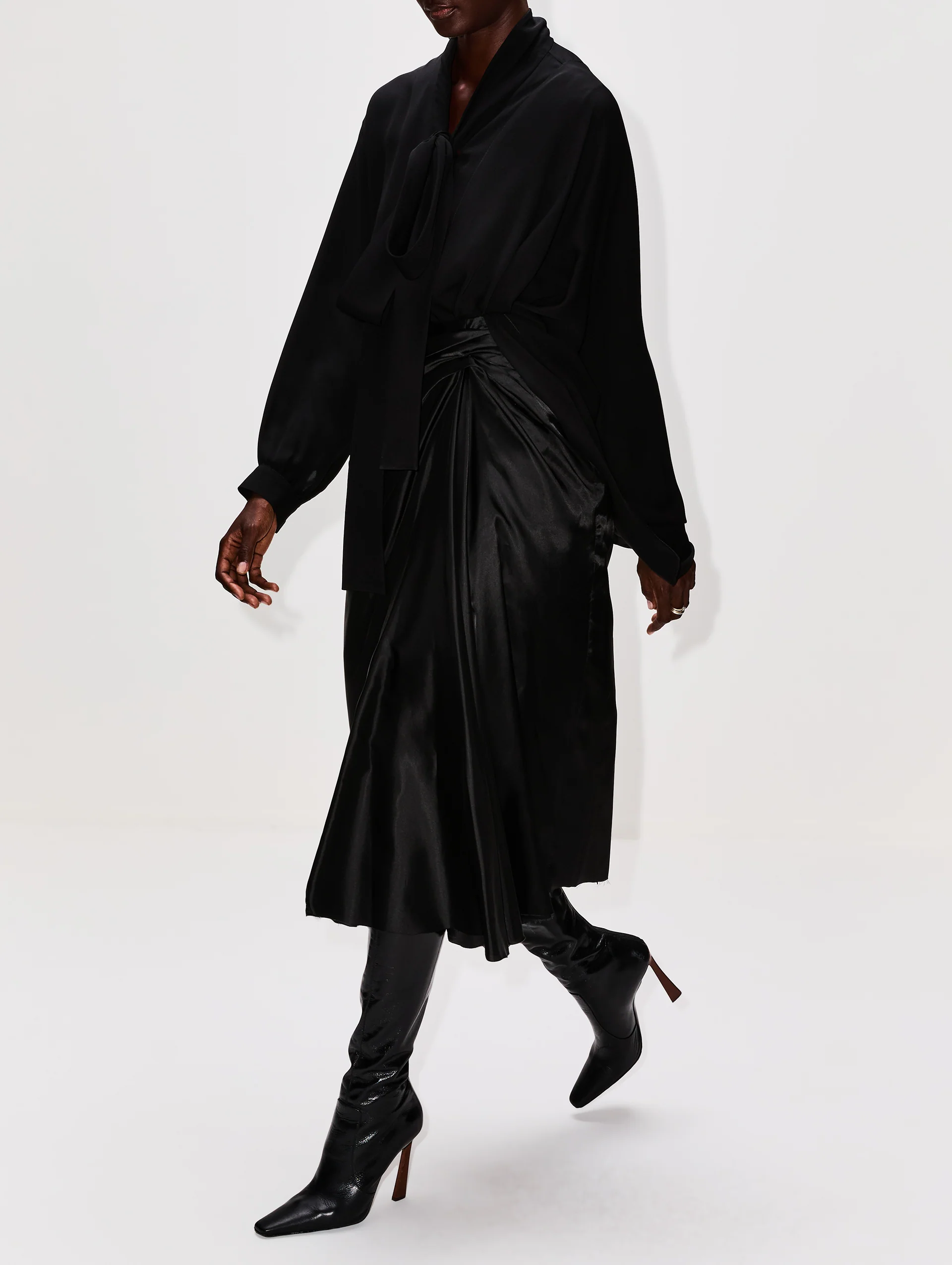Balenciaga's midi skirt embodies edge and elegance with its raw hem, fine cupro fabric and beautifully draped construction, creating a crinkle effect.