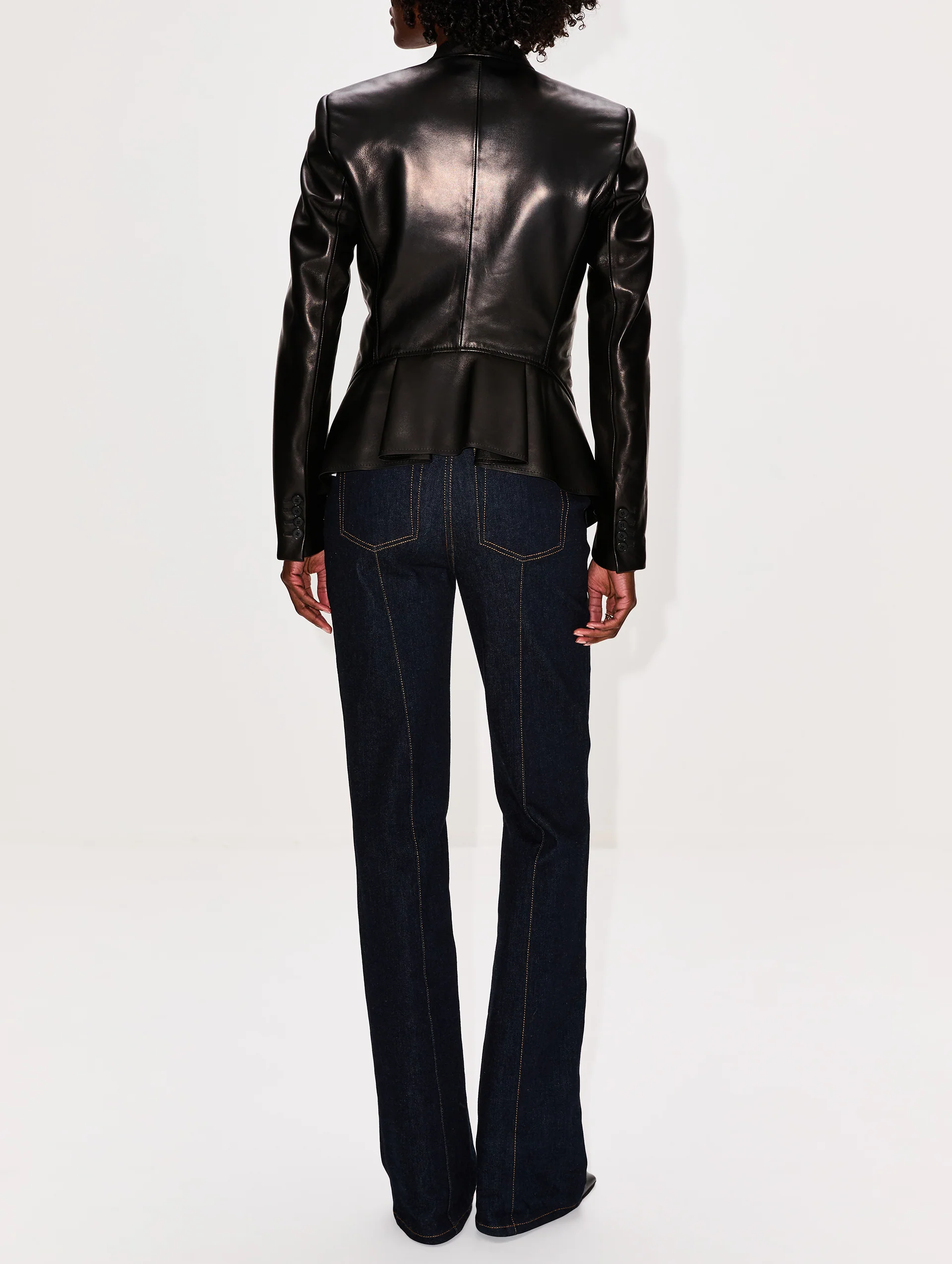 Crafted in Italy from smooth lambskin leather, this impeccably tailored blazer has a slight peplum hem, a V-neckline and a chest welt pocket. The structured shoulders and curved flap pockets at the side frame a nipped-in waist for an hourglass effect.