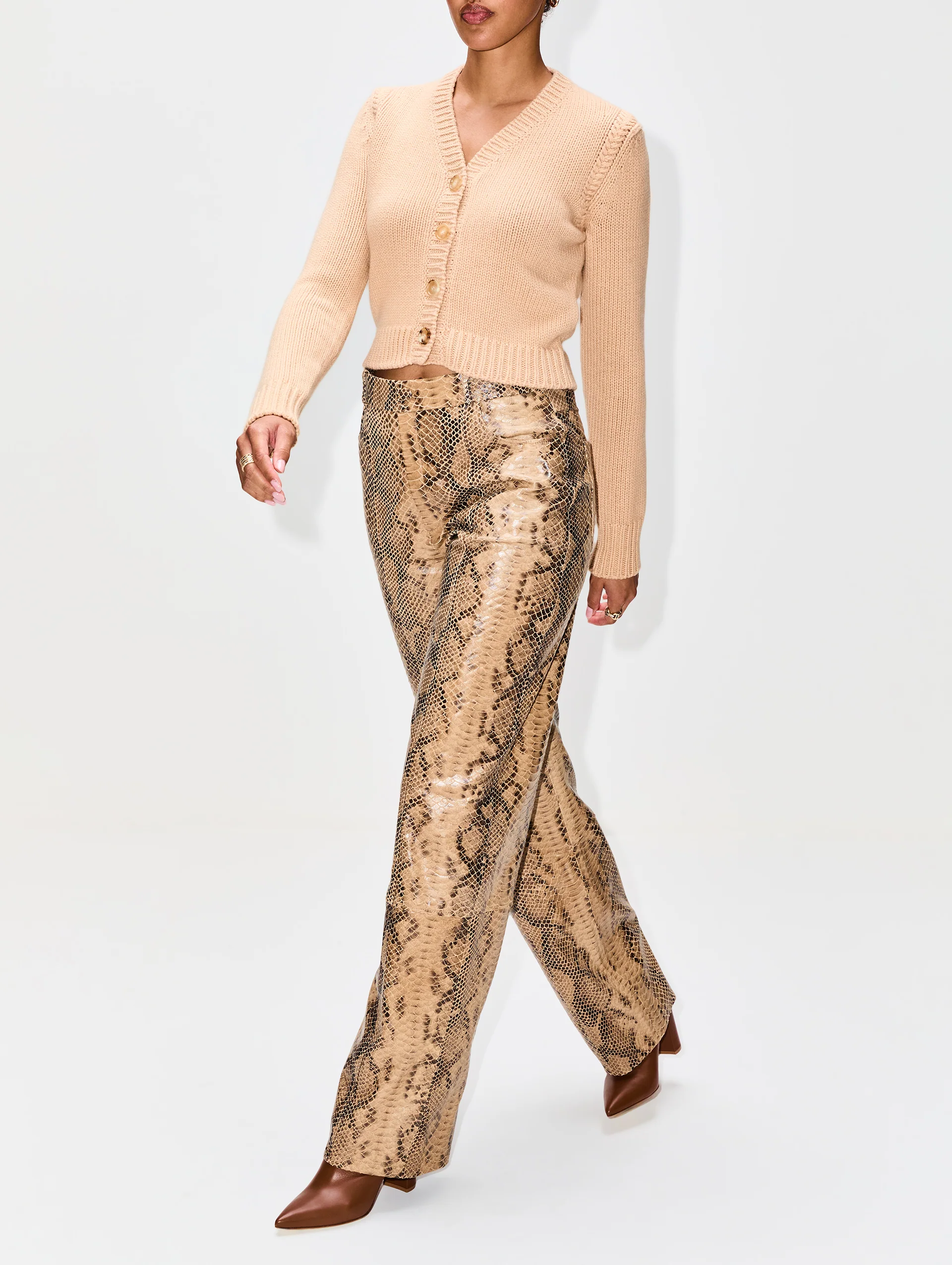 Zeynep Arcay's genuine lambskin leather pant features sculpted mid-leg and central seams, draping seamlessly from a high waist to a full-length wide leg for elevated daily styling.