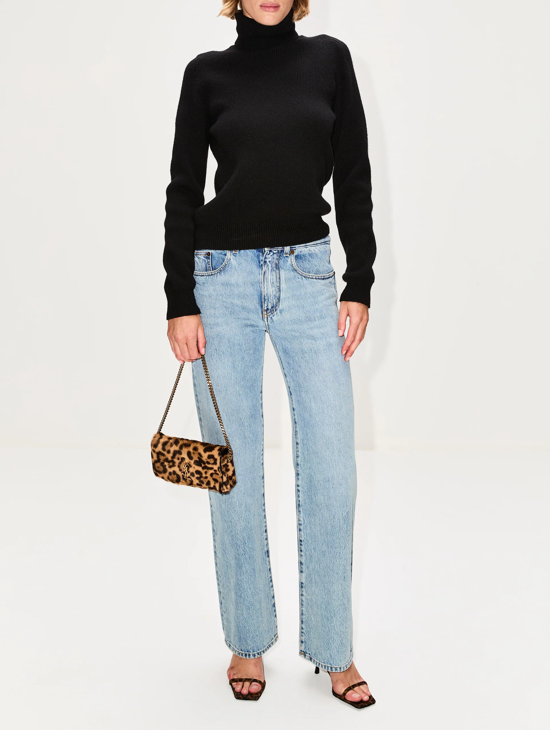 Barely-there straps in leopard cross the foot, paired with a kitten heel and sharp square toe for a step into Saint Laurent's ultra-sleek style.