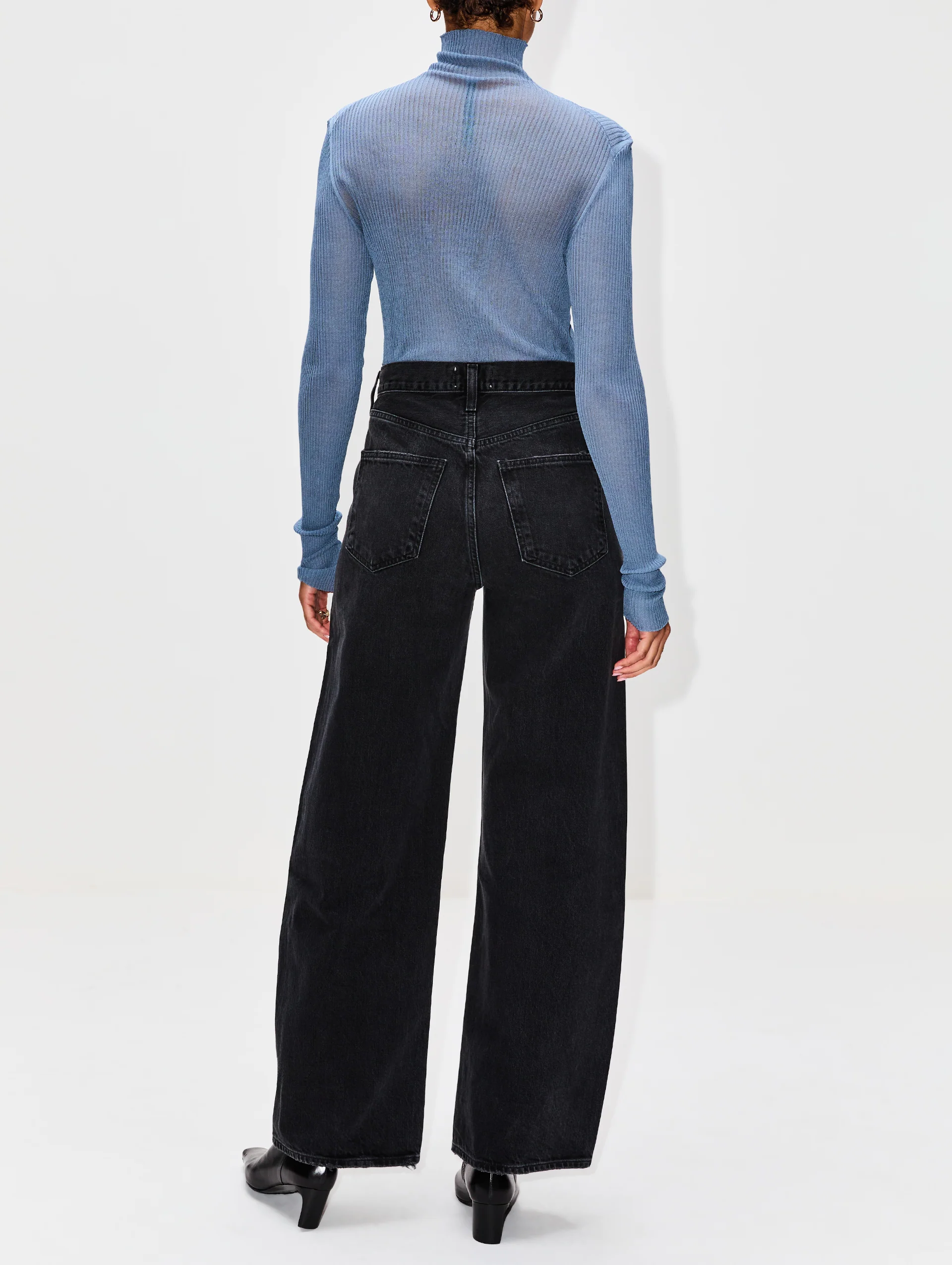 The Knitted Turtleneck Top features a dove-colored, paneled silk knit construction. With a semi-sheer, rib-knit design, it has elongated sleeves and a straight hem creating a slim fit that's both elegant and stylish. Perfect for layering or wearing alone!
