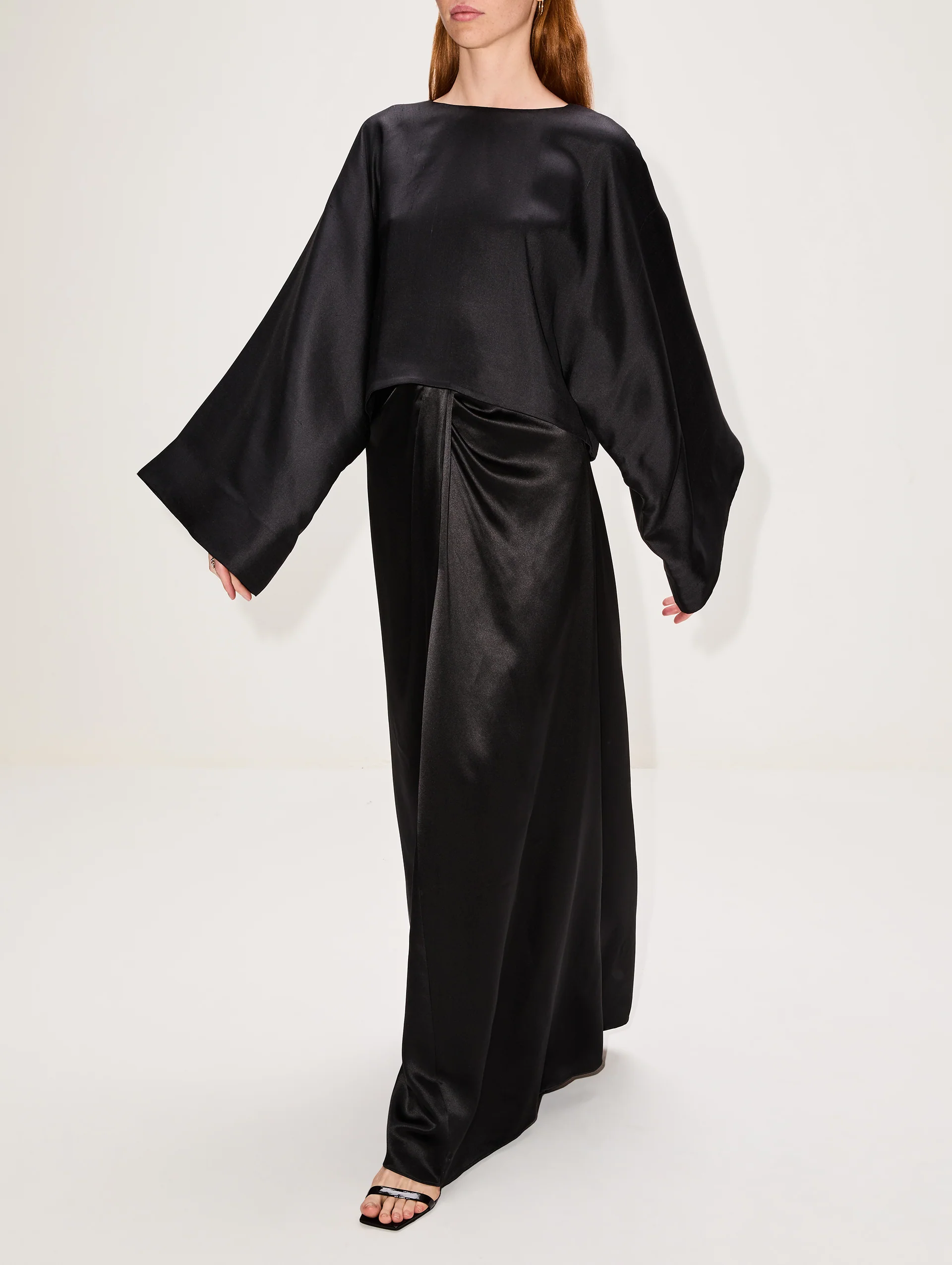 Leticia's signature silhouette is defined by a twisted front waistline and a front godet, casting waves of silk along the skirt's draped floor-length outline.