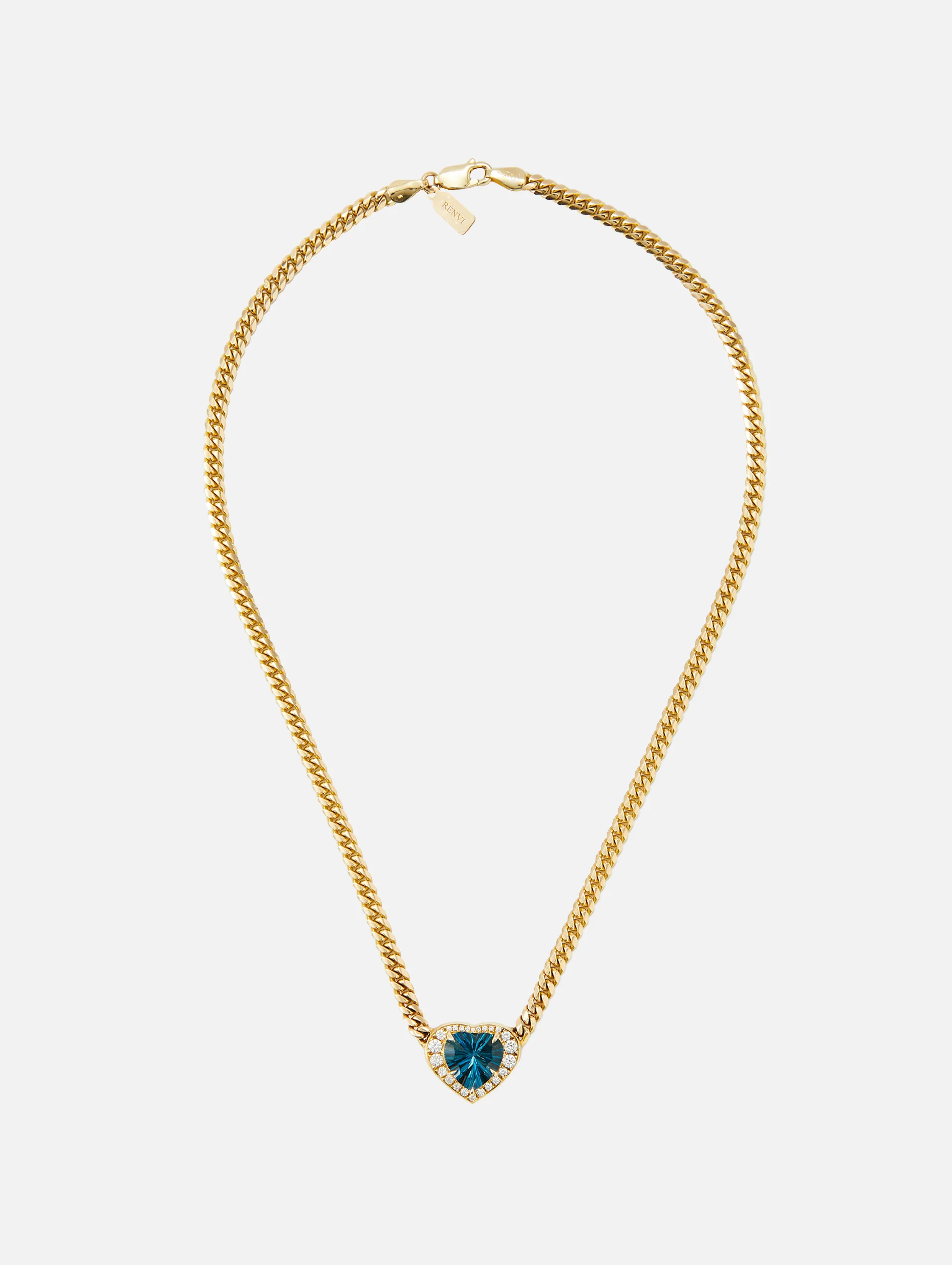 This breathtaking RENVI necklace rides the line between exceptional design and everyday versatility. A sleek 14k gold Cuban chain leads seamlessly into a center heart charm, intricately embellished with diamond accents and a faceted topaz gem.