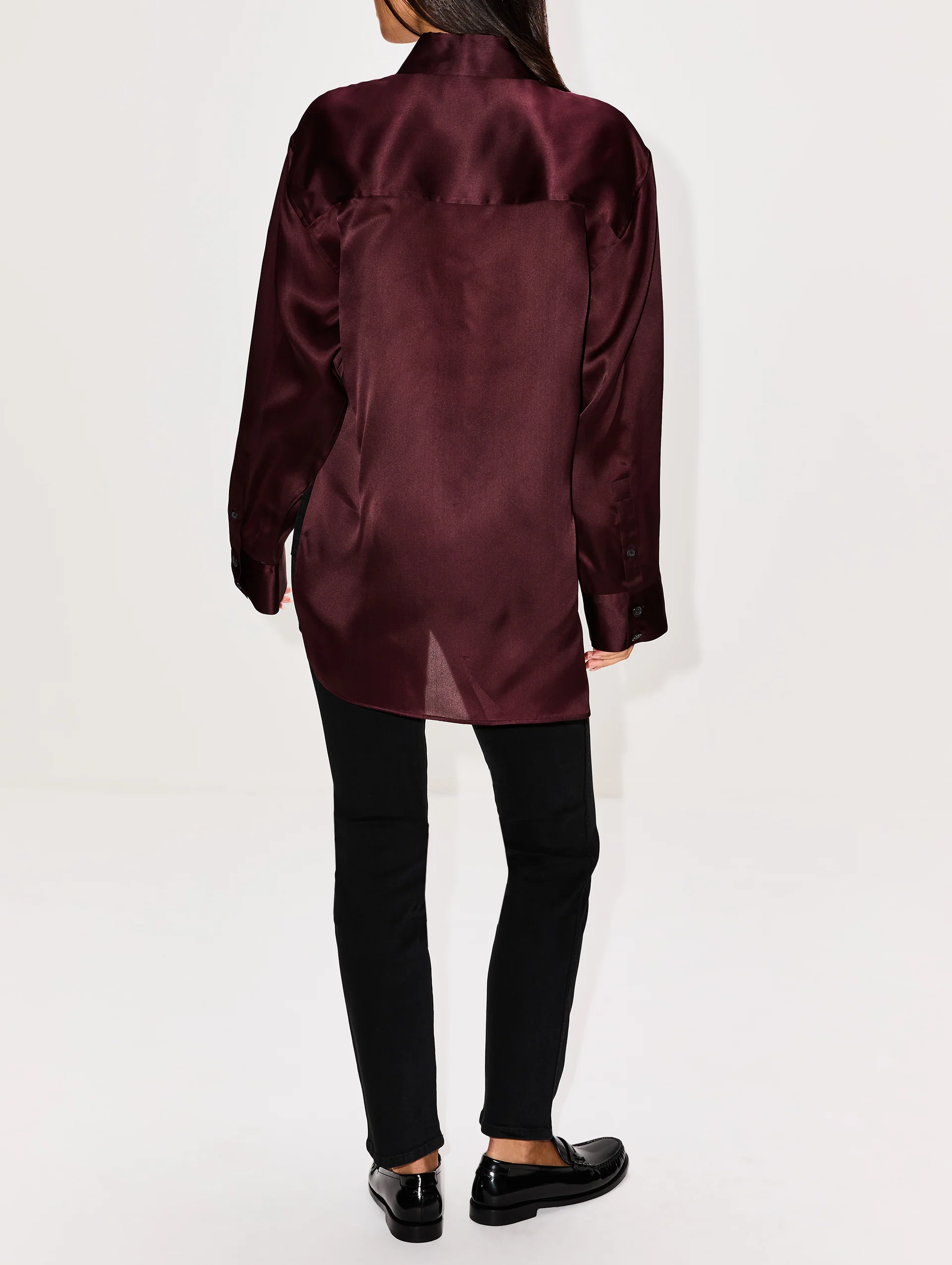 This button-up features a relaxed, elongated fit in lightweight organza, incorporating patch pockets and a crisp collar that lends a utilitarian mood to the luxurious design.