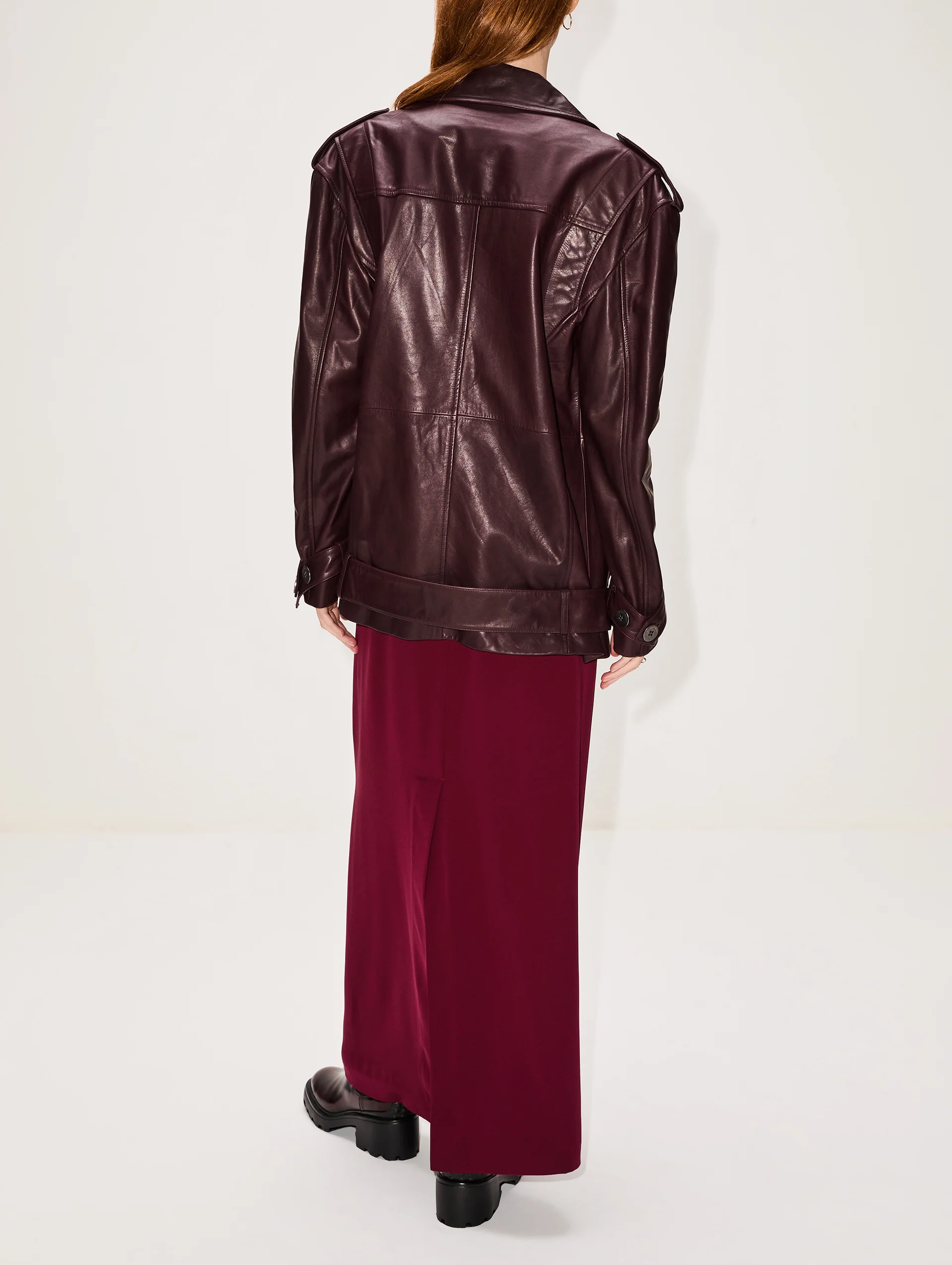 Epaulets, button cuffs, a double-breasted opening and a belted waist fastening highlight this buttery leather jacket's oversized fit.