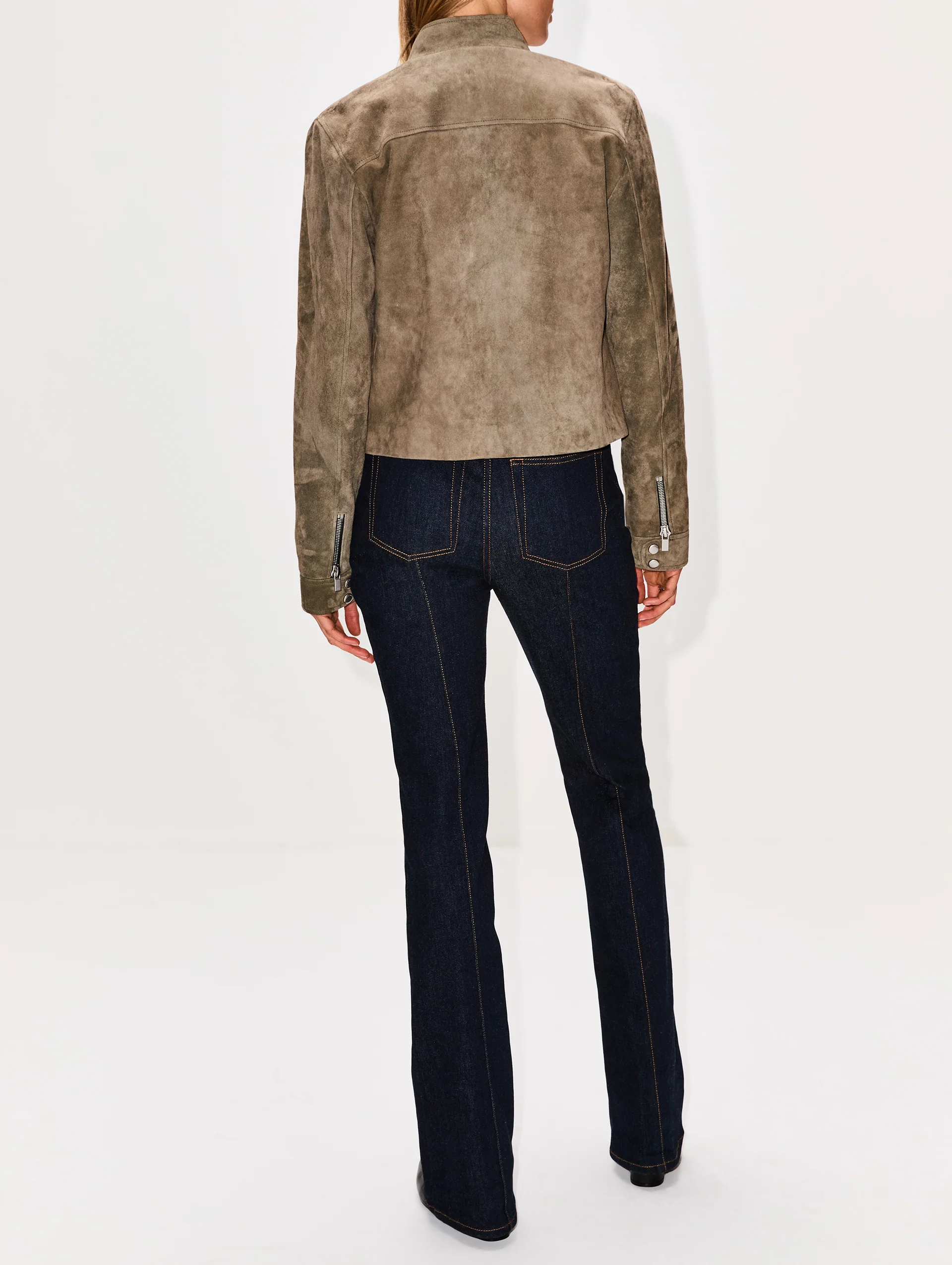 This trim moto jacket fits close to the body for a sleek, modern design accentuated by bold silver hardware and a richly textured sheep suede.