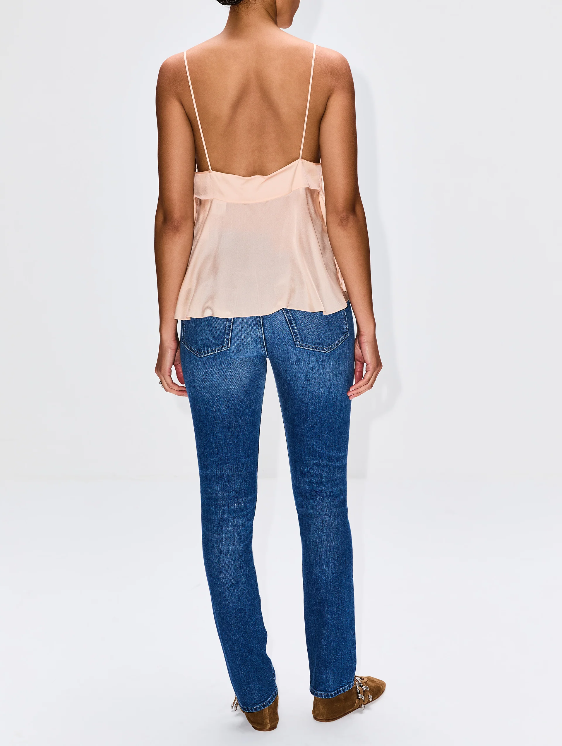 Elevate your wardrobe with this exquisitely tailored top, featuring stunning ruffles and a luxurious silk drawstring empire waist.