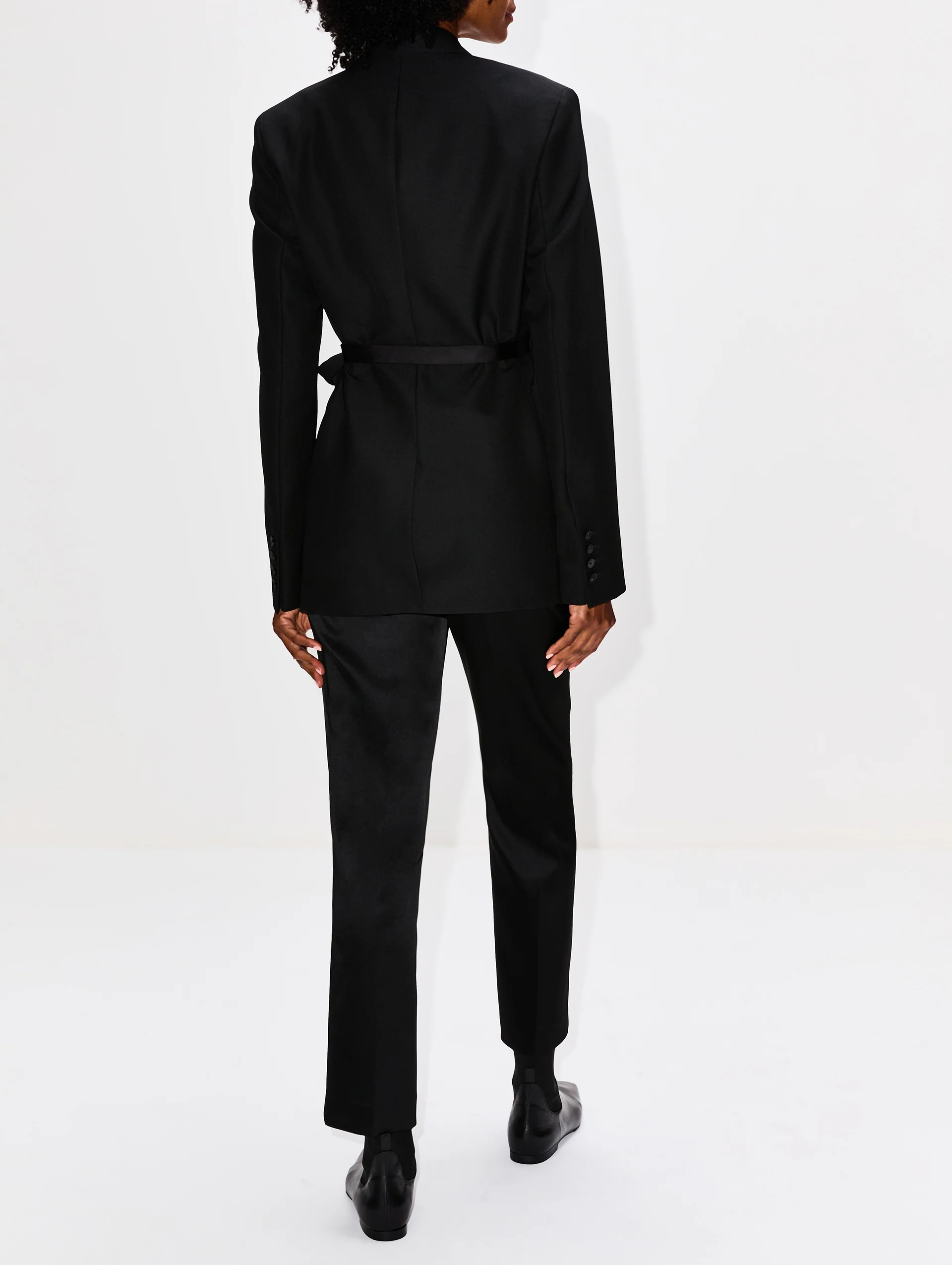 This tuxedo-inspired wrap blazer features a shiny satin lapel and matching side waist ties. Impeccably tailored from suiting fabric, it exudes elegance and sophistication ideal for evening wear or chic daytime looks.