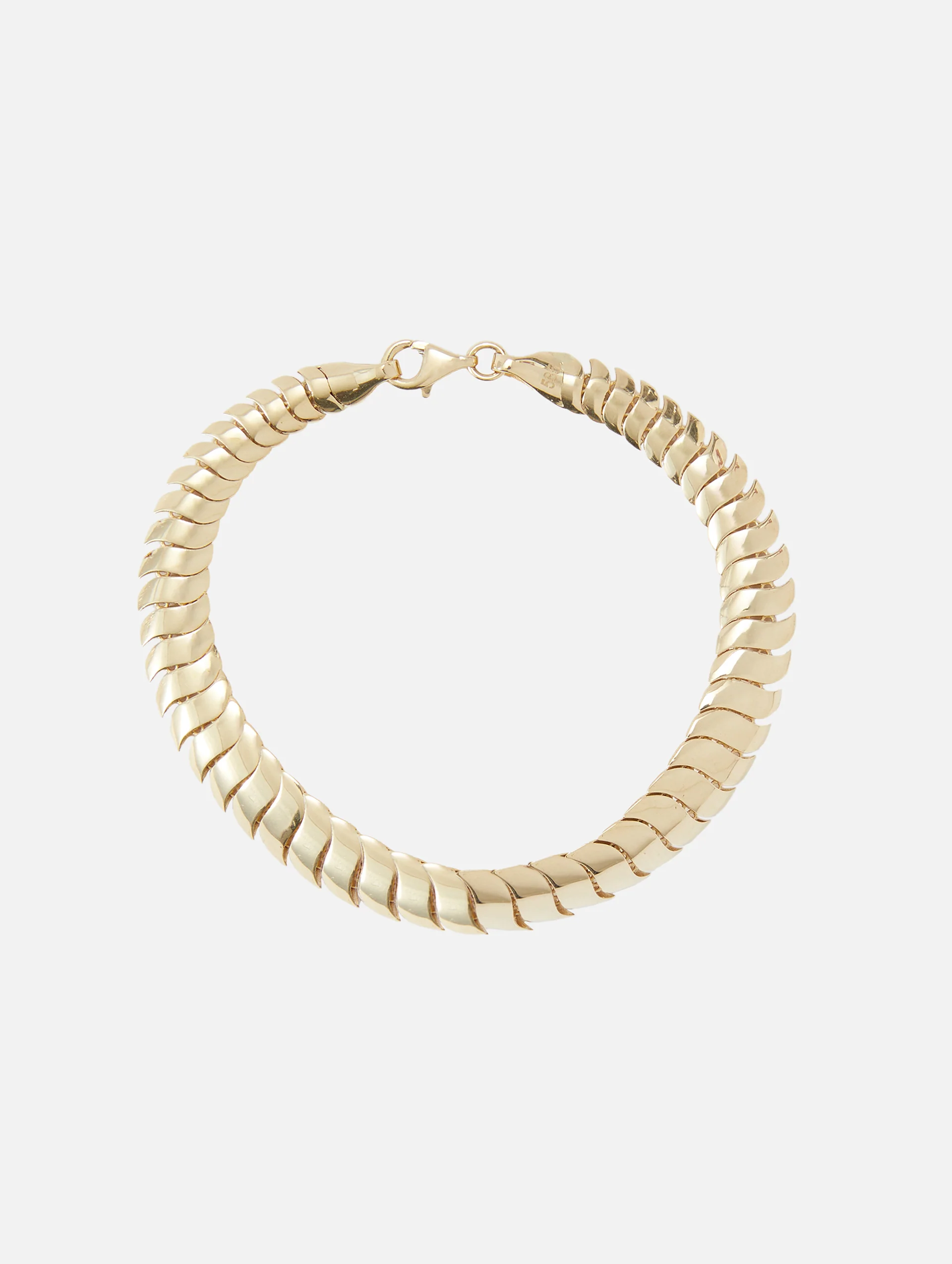 The Cobra Bracelet is truly the queen of snake chains— boasting a widened frame and expertly crafted links made from 14k yellow gold that curve with you're every move.