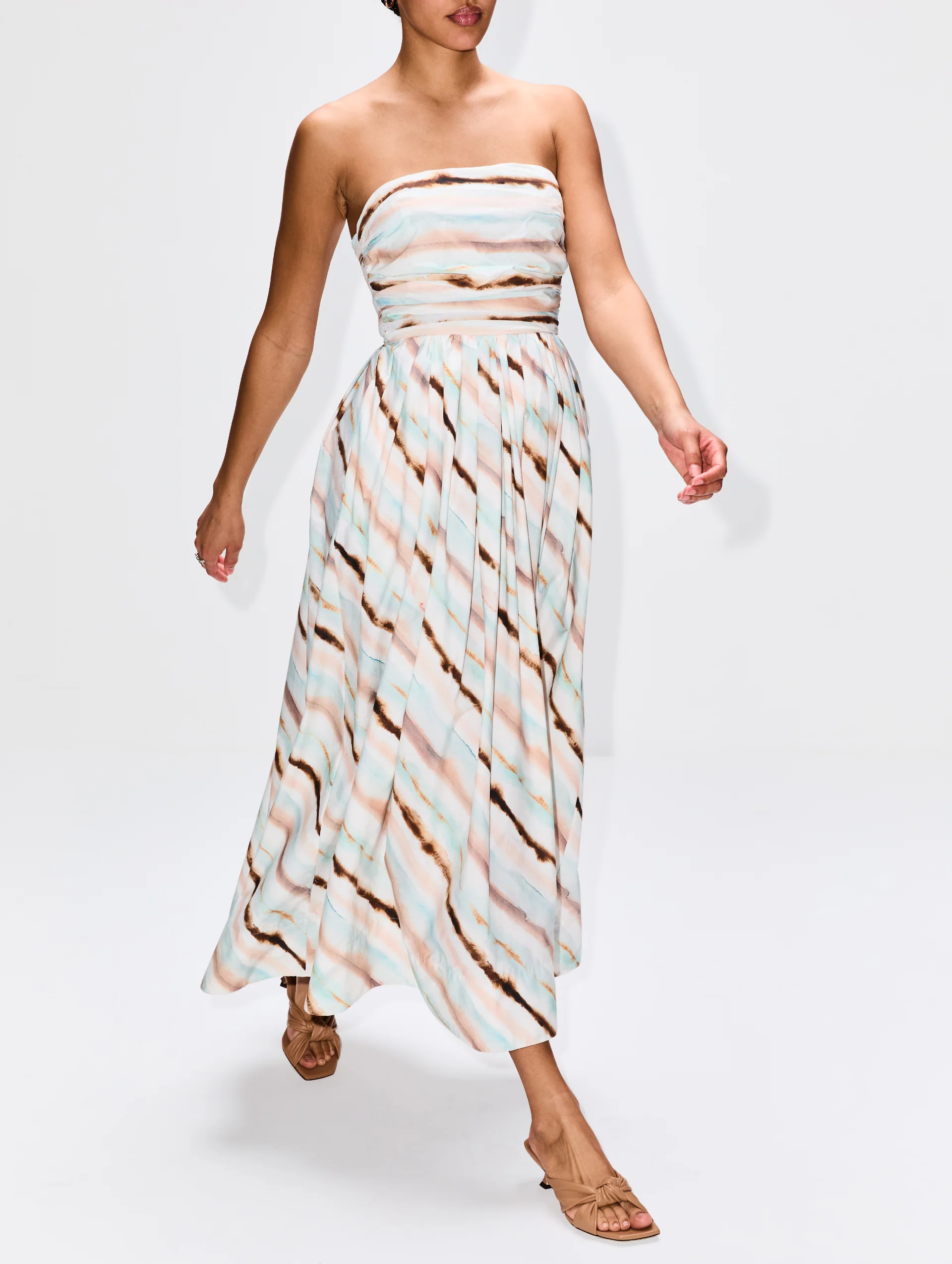 Featuring a feminine strapless silhouette, this midi dress boasts a flowing skirt, soft tie-dye stripes and a wrapped detail just below the bust.