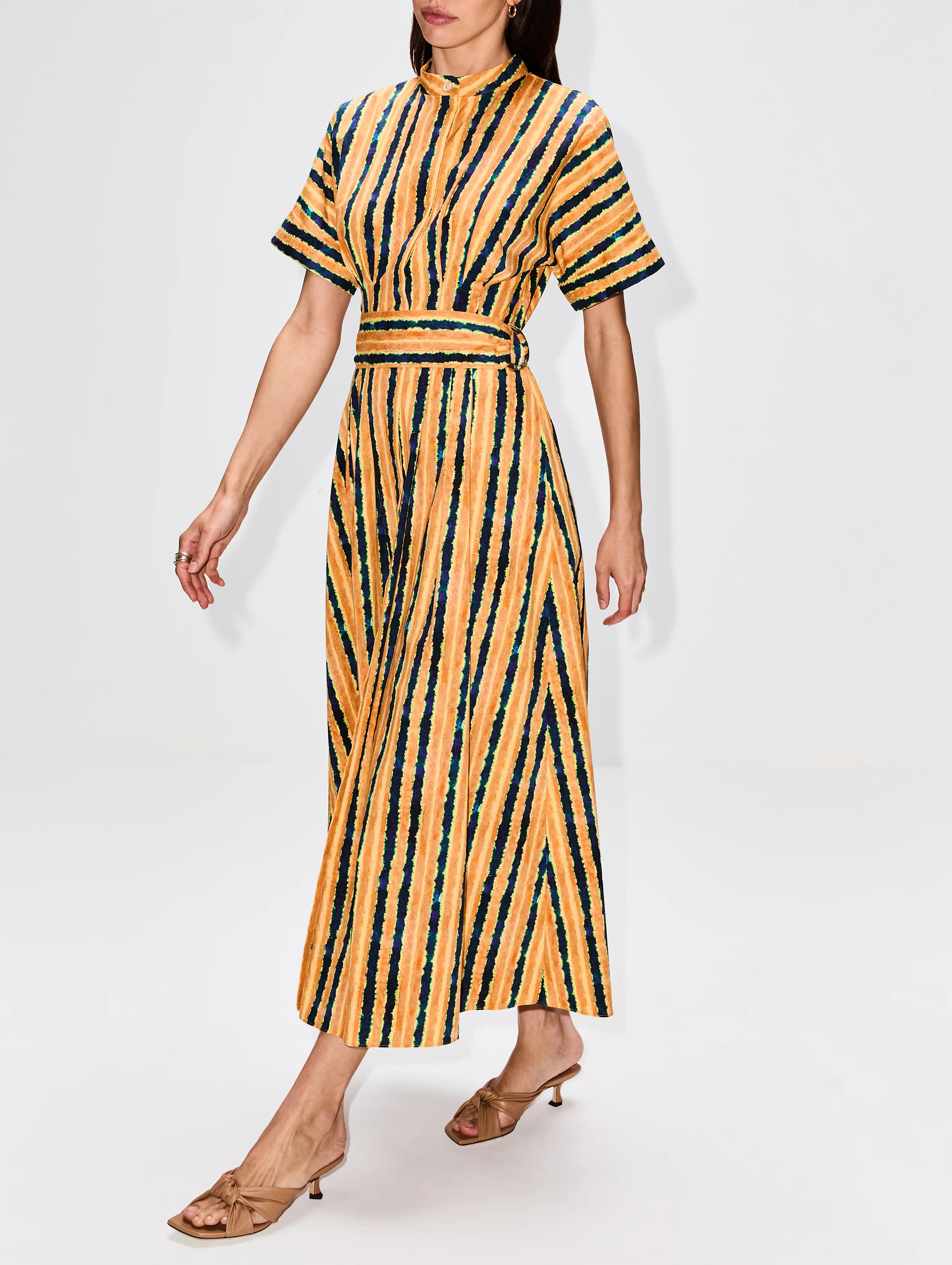 This Amir Taghi Dress is embellished with an artful stripe that accentuates its fit and flare silhouette and tailored shirtdress detail.